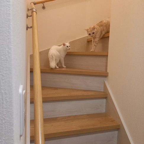 マオちゃんはリビングにあるキャットタワーからダイニング、キッチンへと隅々までチェックをして、そのまま2階へ向かいました。途中、まだ同じ場所にいたポニョと遭遇。何と、お鼻を合わせてご挨拶。緊張気味なポニョをよそに、破天荒なマオちゃんは気にせずそのまま2階へ。