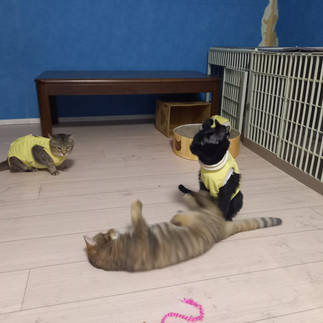 手術が無事終わり、メス猫は抜糸までの間は術後服を着させています。黄色いお揃いの服が園服の様で、元々小柄な子が多い為、可愛い幼稚園児の様でした。